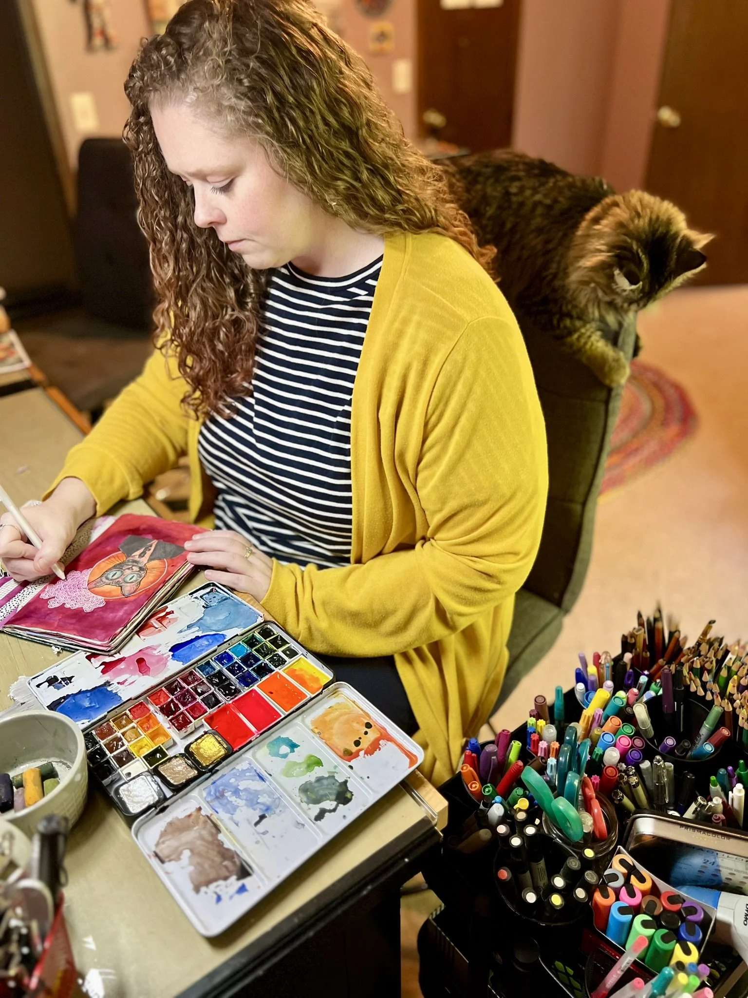 Outside of the therapy room, you’ll probably find me at home in my art studio with my three cats, Tess, Teddy, and Mitts, by my side- art journaling, painting, cross-stitching, getting my hands busy with some kind of project that’s definitely going to involve making a mess; snuggled up with my favorite latte and crocheted blankets reading a good book; or out in the yard tending to my first-ever vegetable garden.